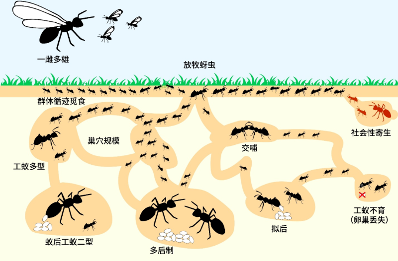 蚂蚁组织中的社会性特征(图片来源:Joel Vizueta等绘)