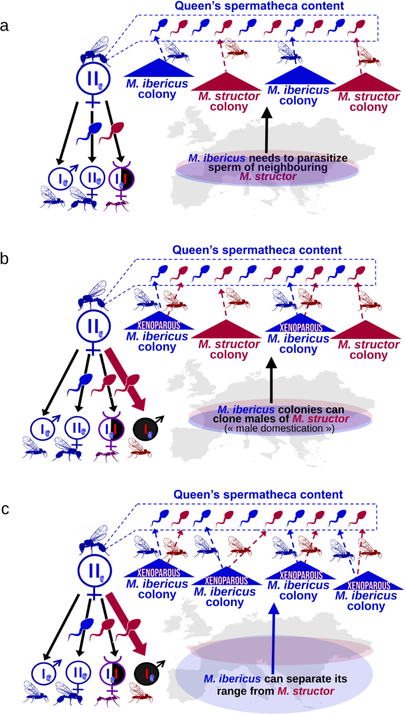下面这张参考图展示了关于伊比利亚收获蚁生态演变的猜想:蚁后最开始与工匠收获蚁生活在同一区域,依赖与工匠收获蚁的雄蚁交配产生工蚁(图a)。在进化过程中,蚁后逐渐开始拥有克隆工匠收获蚁雄蚁的能力(图b)。最终,伊比利亚收获蚁脱离了工匠收获蚁分布区域,即使没有工匠收获蚁的雄蚁供交配,蚁后仍然能产下两个不同物种的后代。