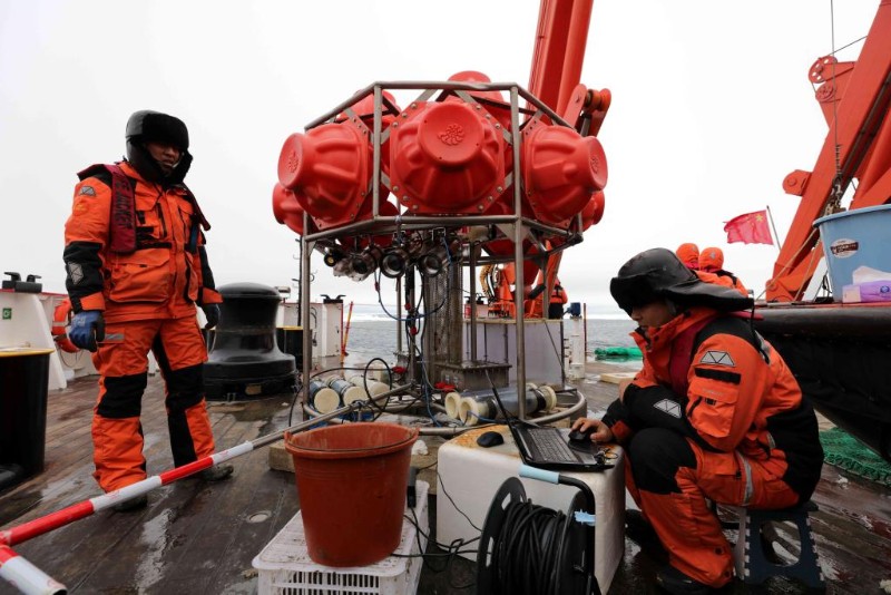 科考队员在回收海底生物影像观测系统(2025年8月14日摄)。新华社记者 刘诗平 摄